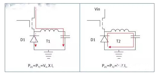 當(dāng)時間為T2時,輸出電流(Iout)流經(jīng)D1。所產(chǎn)生的損耗與D1的正向電壓(Vfw)和輸出電流直接相關(guān)。PT2等于Iout*Vfw。顯然,我們希望盡可能降低以控制損耗,減少發(fā)熱。